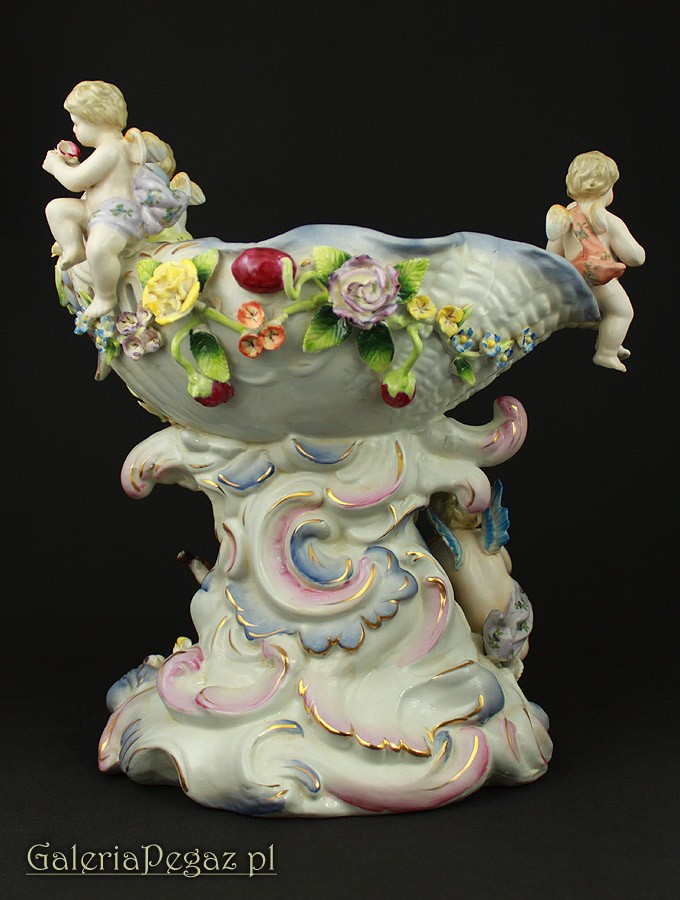 Rokokowa porcelanowa patera bogato zdobiona figurkami cherubinów oraz kolorowymi plastycznymi kwiatami i owocami. Na szczycie patery oraz przy jej podstawie siedzą trzy małe anioły. Dodatkowo znajdujące się przy podstawie figurki trzymają w rękach instrumenty muzyczne na których przygrywają. Całość wieńczą złote zdobienia na krawędziach. Patera znakomicie pomieści łakocie lub owoce. Od spodu porcelana posiada sygnaturę.
