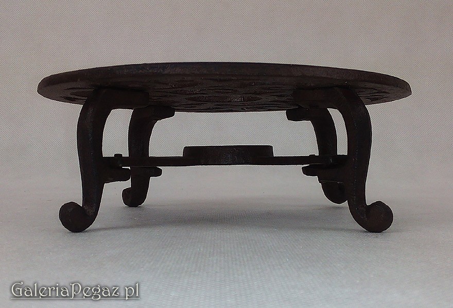 Żeliwny podgrzewacz na naczynia umożliwiający utrzymanie dostatecznej temperatury płynom i potrawą podawanych w domu, lokalu lub na świeżym powietrzu. Na spodzie otwór (gniazdo) mieszczący standardowe parafinowy podgrzewacz. Całość osadzono na czterech nóżkach z umieszczono u góry okrągłą kratką. Prezentowany przedmiot znakomicie pełni funkcje dekoracyjna jak i użytkową.