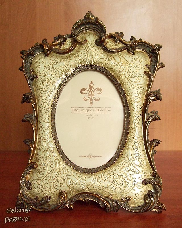 Bardzo wystawna bogato zdobiona ramka do zdjęci. Wykonana z masy alabastrowej pokrywanej różnokolorową farbą i wykwintnymi precyzyjnymi ornamentami rzeźbionymi w masie. Ramka na zajęcia formatu 10x15 cm.