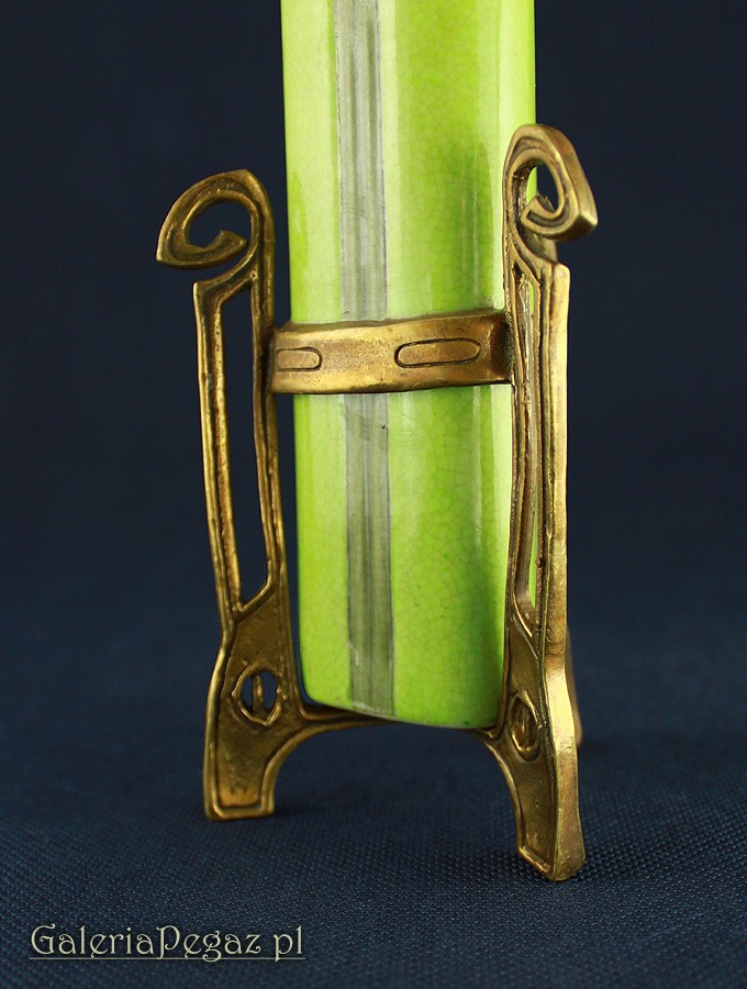 Stylowa i skromny flakon wykonany z porcelany craqelle. Porcelana ręcznie malowana w motywy kwiatowe. Wazon dodatkowy obkuty secesyjnymi zdobieniami wykonanymi z niezapatynowanego brązu. Całość sygnowane na spodzie. Naczynie znakomicie nadaje się jako gustowny rekwizyt będący znakomitą dekoracją Państwa otoczenia.