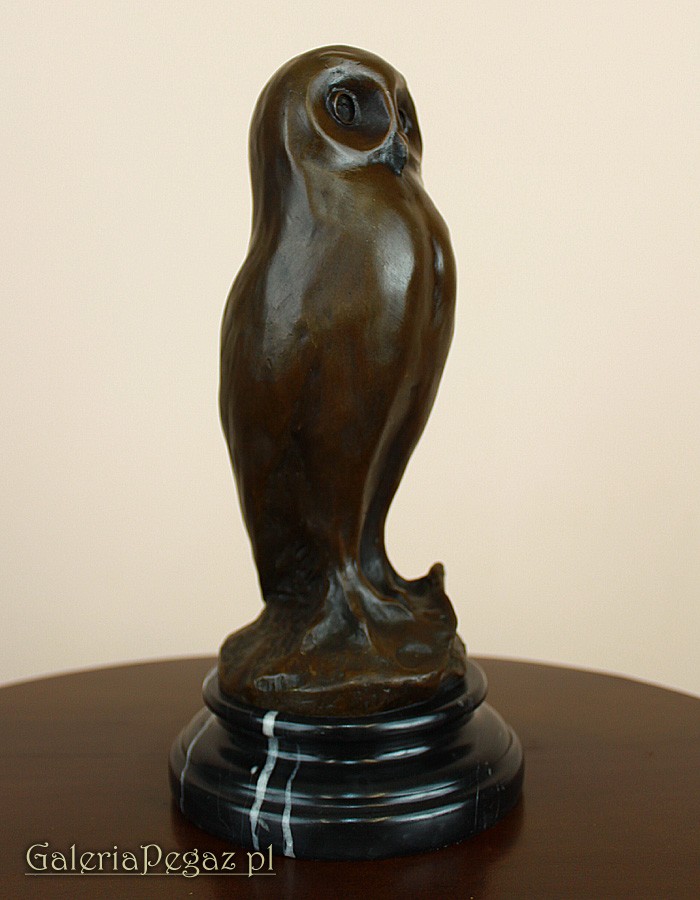 Oryginalna rzeźba Art Deco przedstawiająca sowę - ptaka który to już od czasów starożytnych był symbolem mądrości. Figura została wykonana w całości z brązu i osadzona na marmurowym cokole. Dzieło wykonane bardzo precyzyjnie z dbałością o szczegóły. Brąz sygnowany, Marmur od spodu podklejony zamszem.