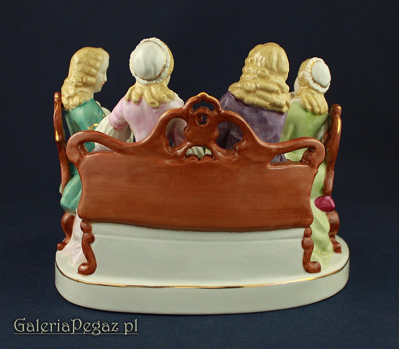 Wystawna porcelanowa grupa czterech figury w stylu rokokowym. Figury zostały przedstawione jako grające w karty i pijące herbatę. Szlacheckie pochodzenie postaci zdradzają wykwintne, dekorowane szaty zdobione ręcznie malowanymi kwiatami i złoceniami na krawędziach. Figury bardzo staranie wymodelowane i osadzone na porcelanowym postumencie. Od spodu porcelana posiada sygnaturę pod szkliwem.
