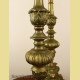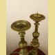 Para dużych, podłogowych, mosiężnych, sakralnych lichtarzy osadzonych na trójbocznych stopach przypominające lwie łapy. Trzon zdobią dekorowane ornamentem roślinnym tuleje. W lekko wypukłych talerzykach osadzone są asymetryczne kolce na świecę. Świeczniki masywne, dobrze zachowane.