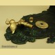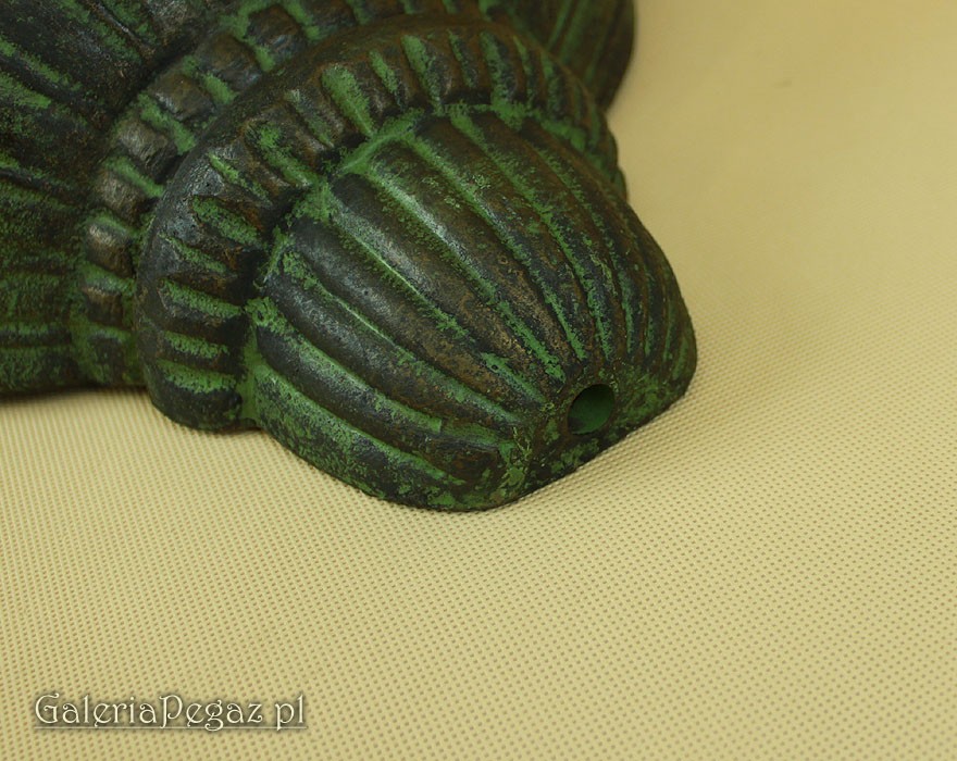 Duża żeliwna wisząca wylewka (zlew) w kolorze czarno-zieloym zdobiona ornamentem roślinnym. Wylewkę można przymocować do fasady budynku lub innej architektury ogrodowej. Zlew skręcony z dwóch części – dolnej i górnej. W zestawie ze zlewem mosiężny dekoracyjny kran z kaczką o gwincie zewnętrznym 3/4 cala służący do połączenia z wcześniej wykonanym przyłączem. Do kranu dodatkowo dołączony łącznik oraz rozeta maskująca kran. Zlew posiada odprowadzenia wody maskowane specjalną obudową. Patyna którą powleczony został zlew zapewnia mu trwałość i odporność na warunki atmosferyczne. Wylewka przygotowana jest do pomalowania na dowolny kolor. Całość tworzy trwałą i funkcjonalną dekorację Państwa ogrodu.